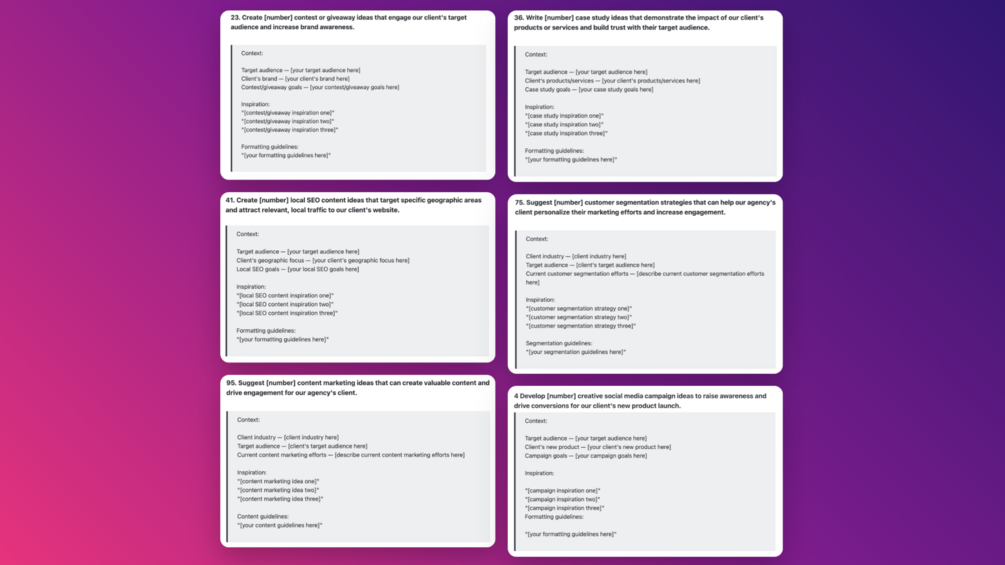 All you need to do is choose the template that fits your specific needs, copy the prompt, and fill in the necessary information. It's that simple! Our templates are easy to use, even for those without a prior marketing experience.